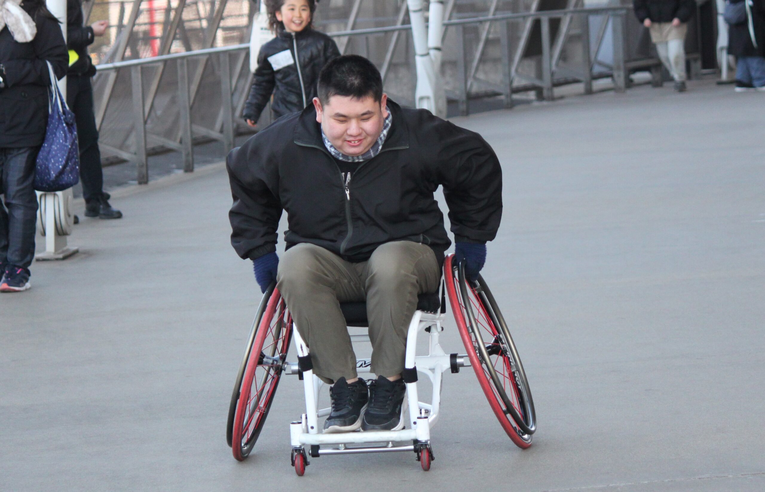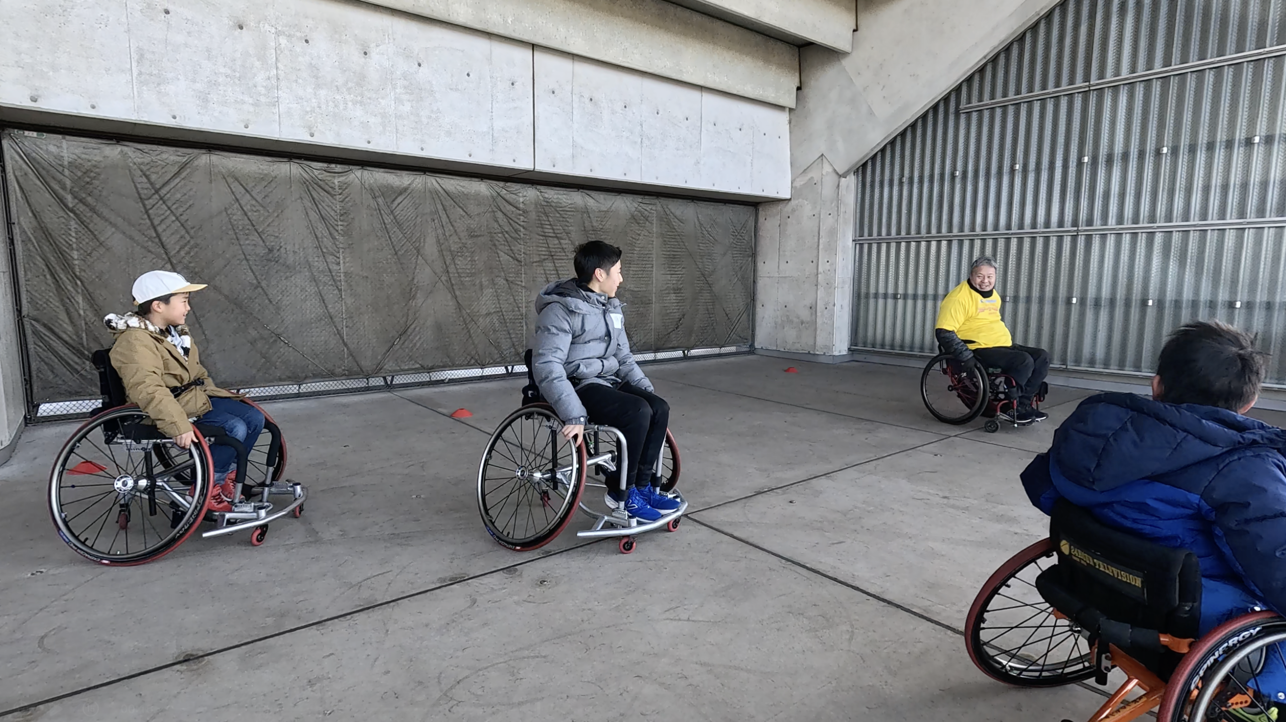 競技用の車いすに乗り、前に進む・止まる、曲がるといった車いすの基本操作を楽しもう!というコーナーです。本コーナーは、きっかけプロジェクトのプロデューサーである京谷和幸が講師を務めました。