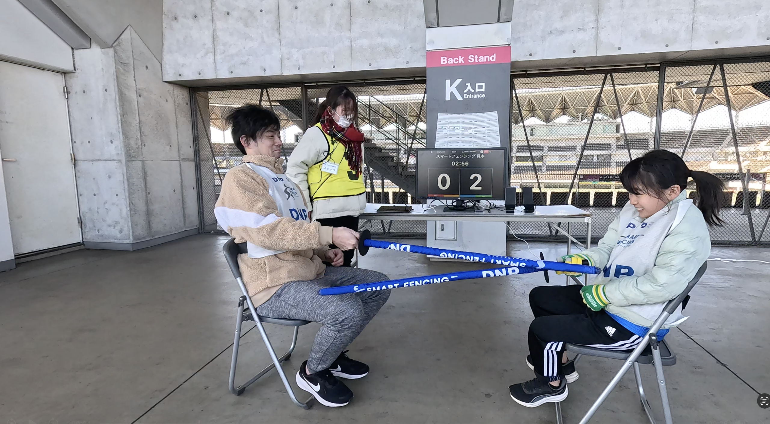 スマートフェンシング®️を使用し、フェンシング体験を行いました。あまり体験する機会のない競技ではありますが、今回は当たっても痛くない柔らかい剣を使用し、安全に配慮した形で実施しました。本コーナーでは、パラフェンシング日本代表の安直樹さんに講師を務めていただきました。