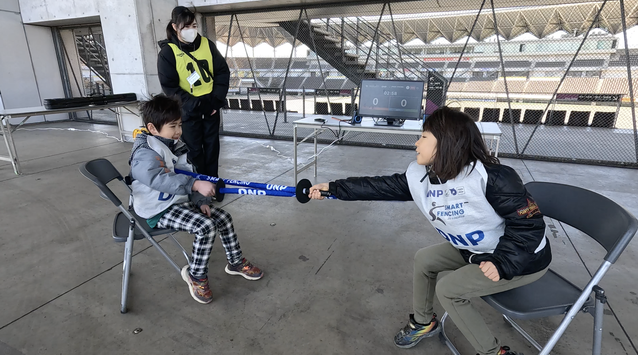 はじめは、構え方や間合いの取り方に戸惑う様子も見られましたが、一対一で向き合うフェンシングならではの緊張感と集中力を味わいながら、はじめて体験する競技に挑戦する楽しさを感じられる時間となりました。